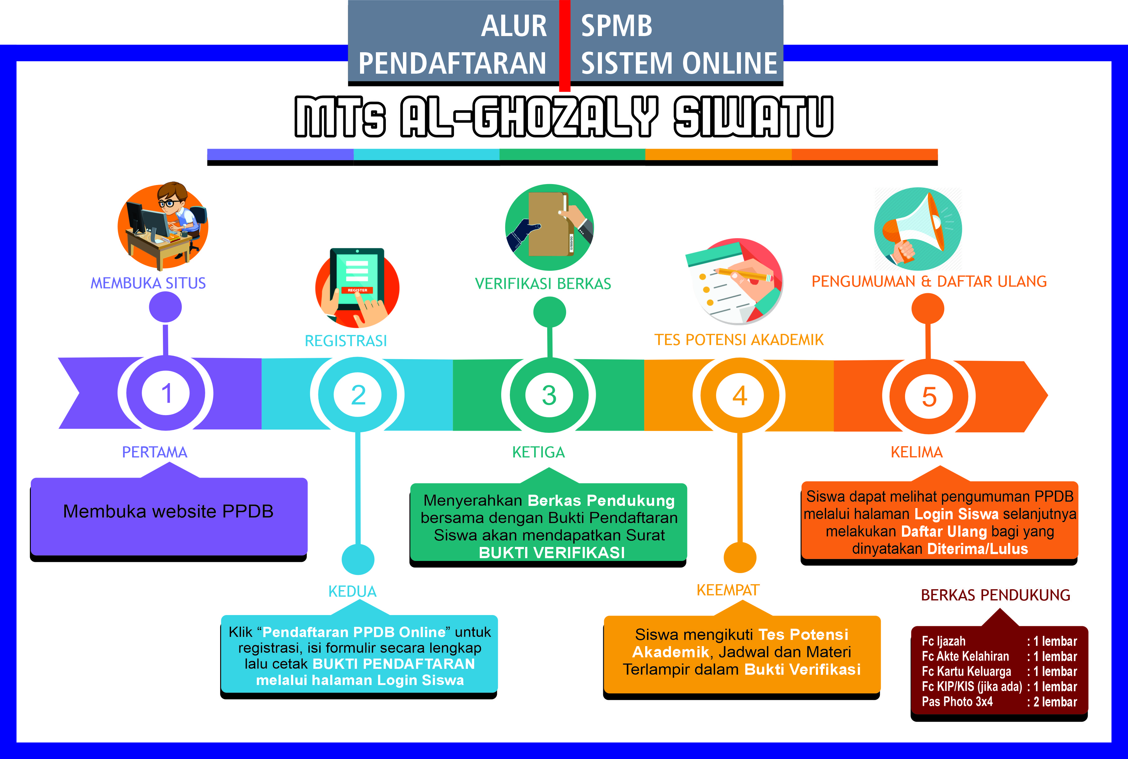 MTs AL GHOZALY menyediakan SPMB secara online diharapkan proses SPMB dapat berjalan cepat dan bisa dilakukan dimanapun dan kapanpun selama sesi SPMB Online dibuka. Proses pendaftaran calon siswa baru tidak menggunakan formulir konvensional hanya dengan mengakses website SPMB Online MTs AL GHOZALY.